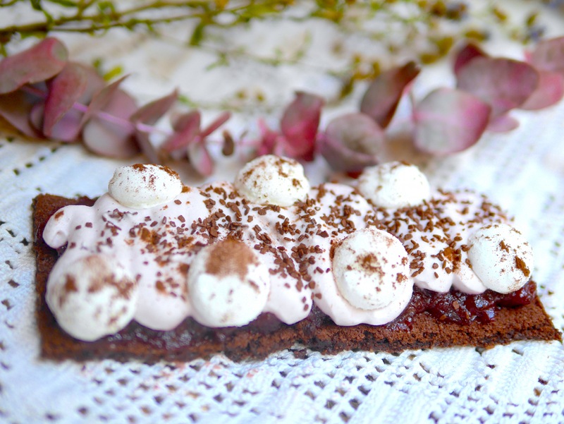 Biscuit dacquoise au chocolat, chantilly au cassis et meringuettes en deux façons