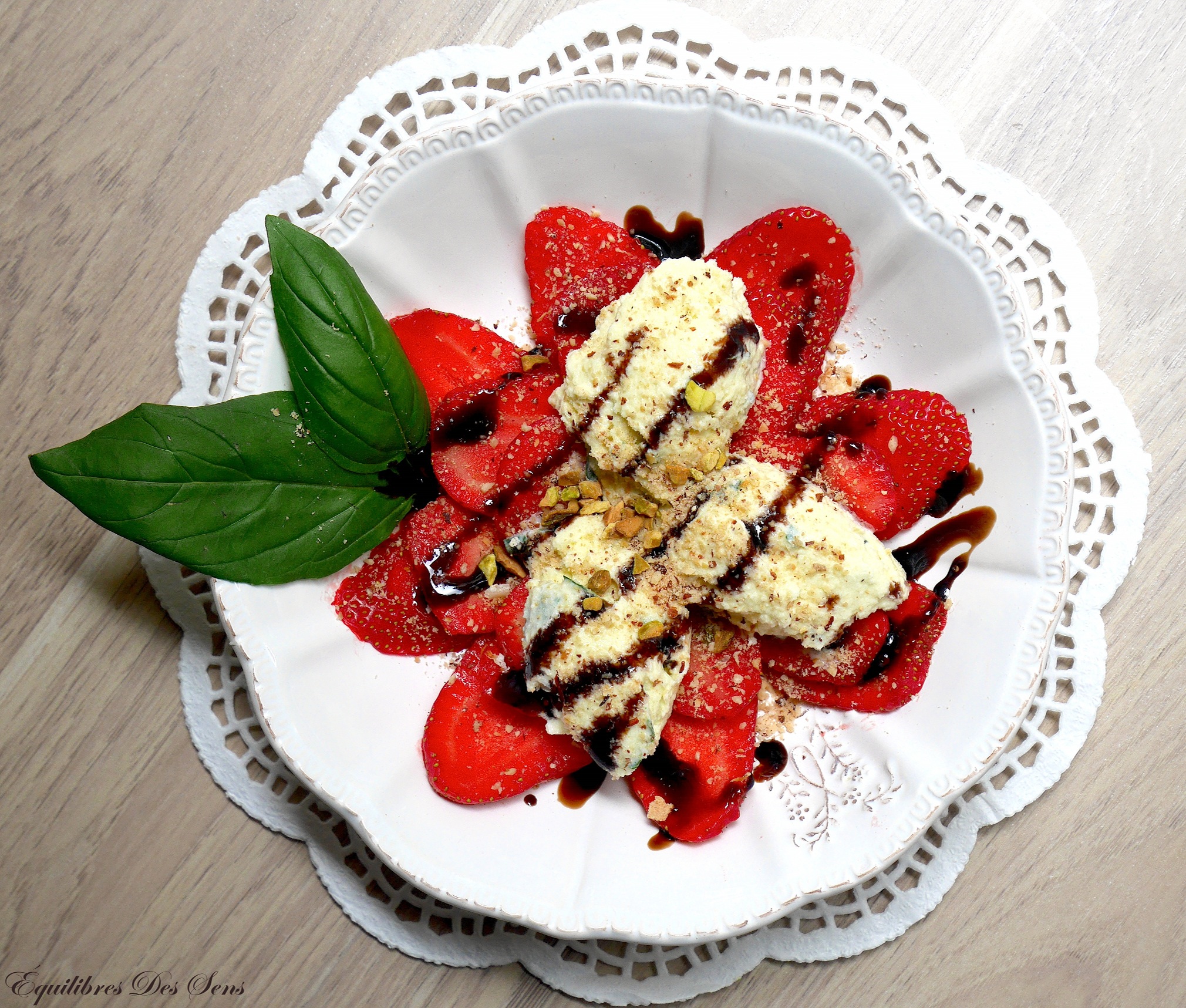 Carpaccio de fraises, glace au basilic et crème de balsamique 🍓