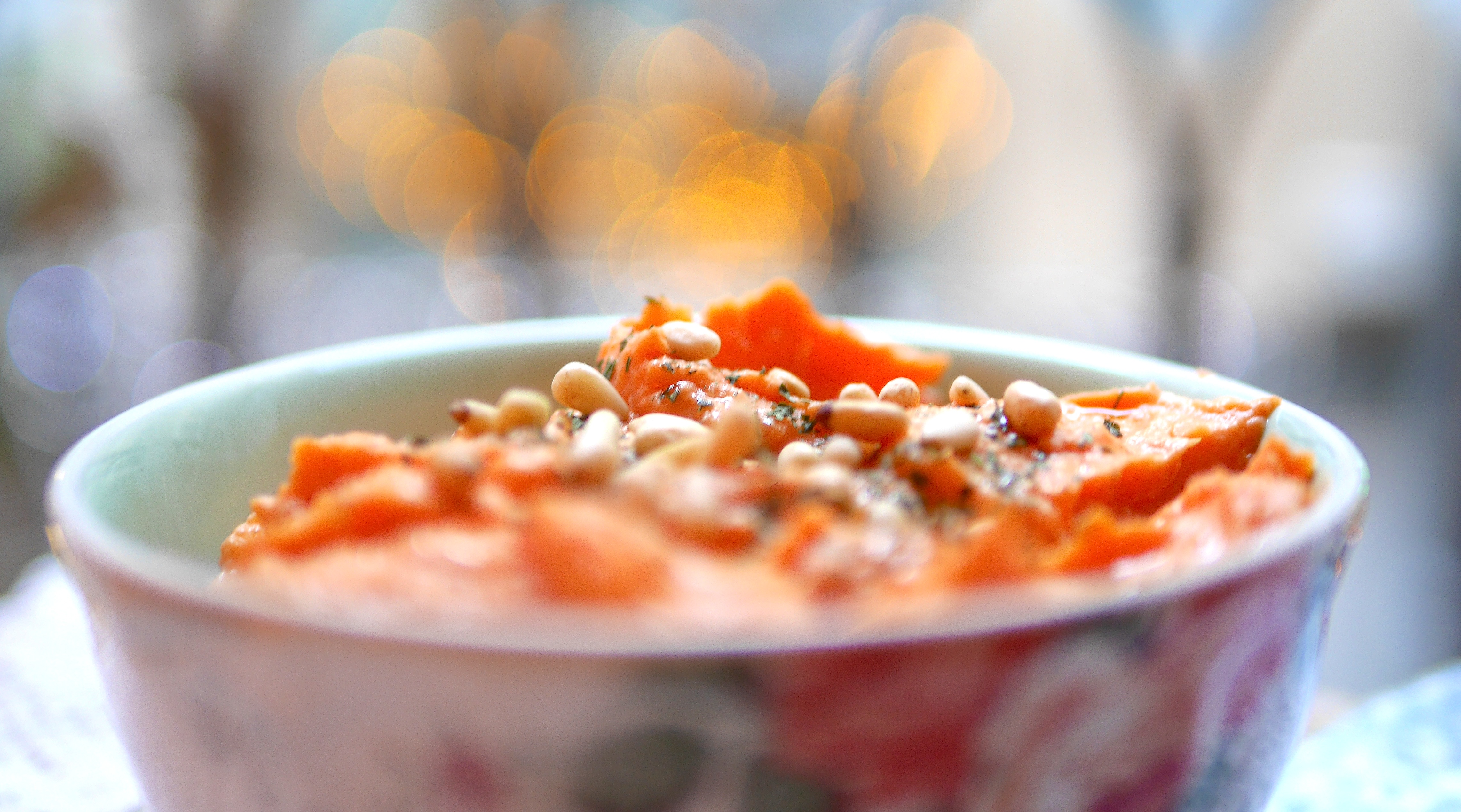 - Il est possible de parsemer des pignons grillés ou des noisettes torréfiées sur la purée et de terminer avec un filet d'huile de pépins de courge.