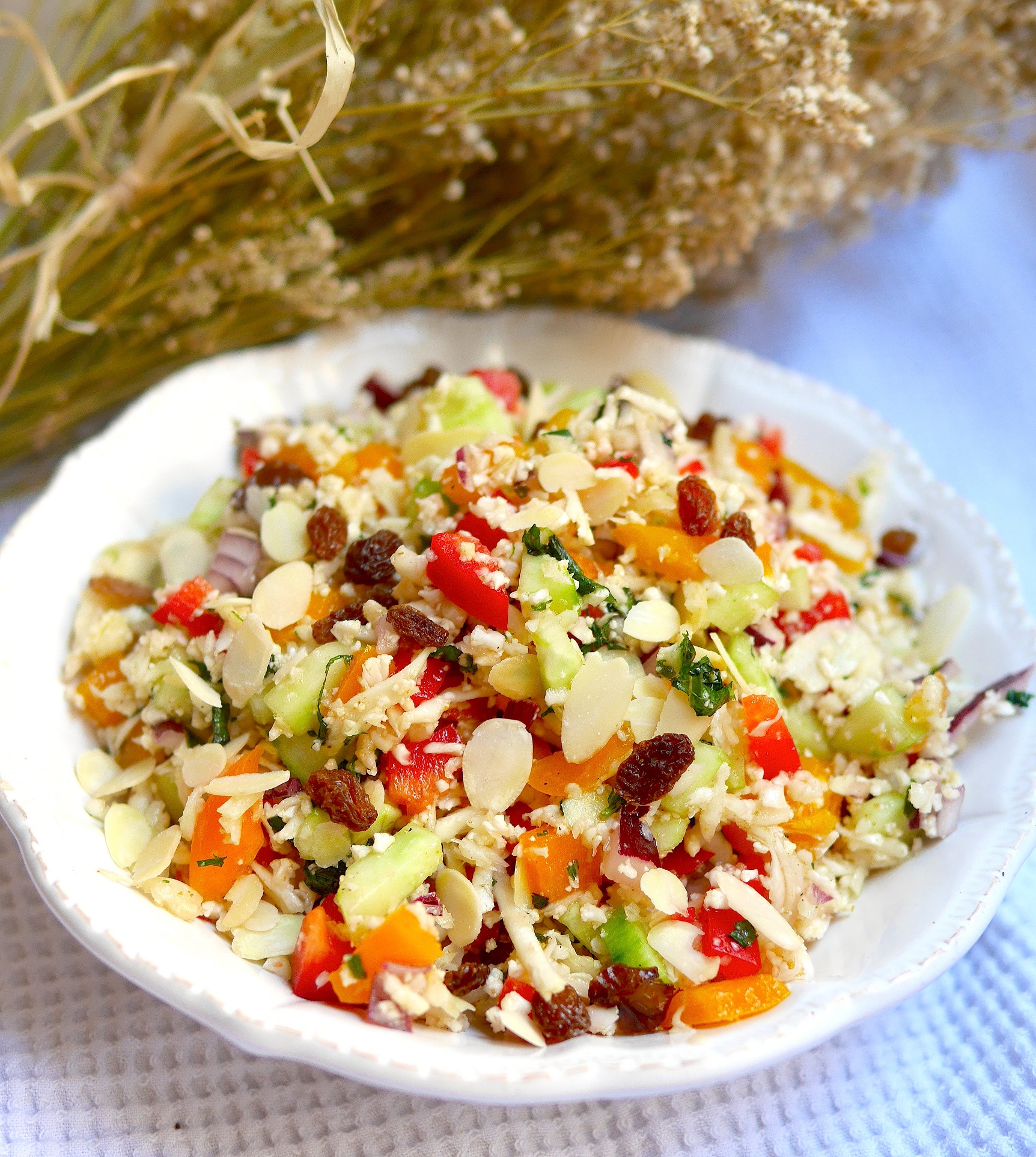 Comme dans un taboulé traditionnel, le chou-fleur s’accompagne d’oignons, de tomates, de poivrons, de concombre, d’huile d’olive, de jus de citron, de menthe fraîche, de raisins secs, de quelques amandes effilées et d’un brin de cumin !