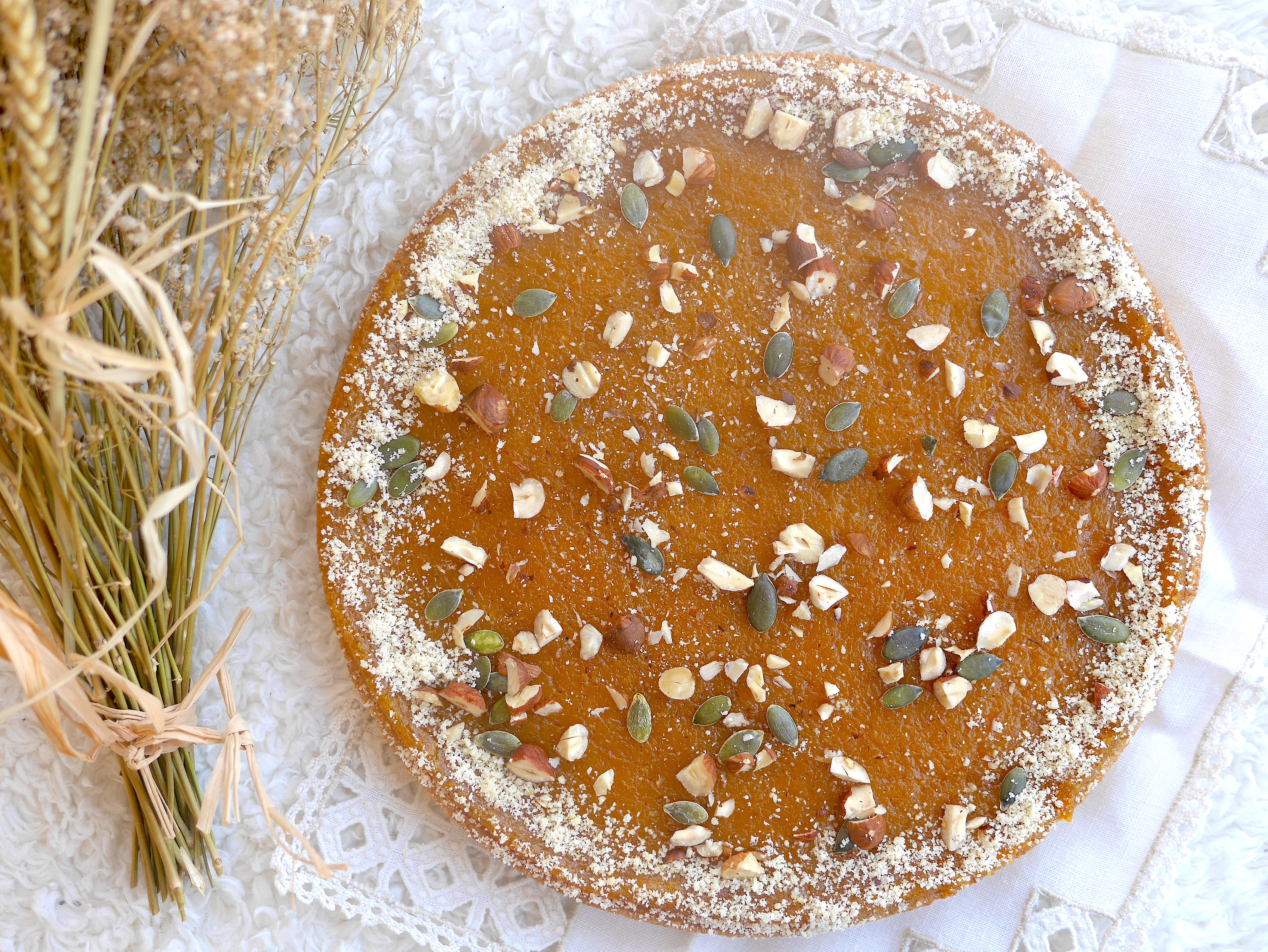 - Pour l'appareil, faites cuire le potiron à la vapeur jusqu'à ce que les morceaux soient tendres et mixez-les pour obtenir une purée. Mélangez 500g de cette purée avec le sucre de canne, la margarine végétale, la poudre de noisettes, la fécule de maïs, la crème végétale et le sirop d'agave. Terminez en assaisonnant à votre goût avec les épices et le sel.